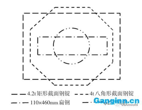 實(shí)驗(yàn)鋼的生產(chǎn)工藝流程:30t EAF+LF+VD冶煉廠→模鑄4.2t矩形框橫截面鑄鋼件和4t八角形橫截面鑄鋼件→鑄鋼件加溫→2,000t快鍛機(jī)鍛制110×460Mm鍍鋅扁鋼和 ? 250Mm園鋼→不銹鋼板材淬火→取片檢測。