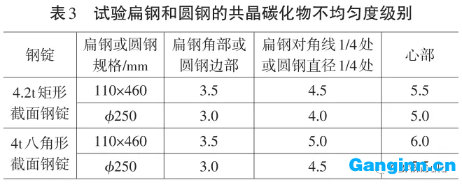 由圖3和表4由此可見, 不管4.2t矩形框橫截面鑄鋼件, 還是4t八角形橫截面鑄鋼件, 鍛制的鍍鋅扁鋼和園鋼煅造比 (橫截面總面積比) 雖非常, 但橫截面直線或直徑比園鋼超過鍍鋅扁鋼, 園鋼約是鍍鋅扁鋼的2倍, 因此, 實(shí)驗(yàn)的鍍鋅扁鋼和園鋼對比, 園鋼比鍍鋅扁鋼的共晶滲碳體形變充足, 不勻稱度級別低。