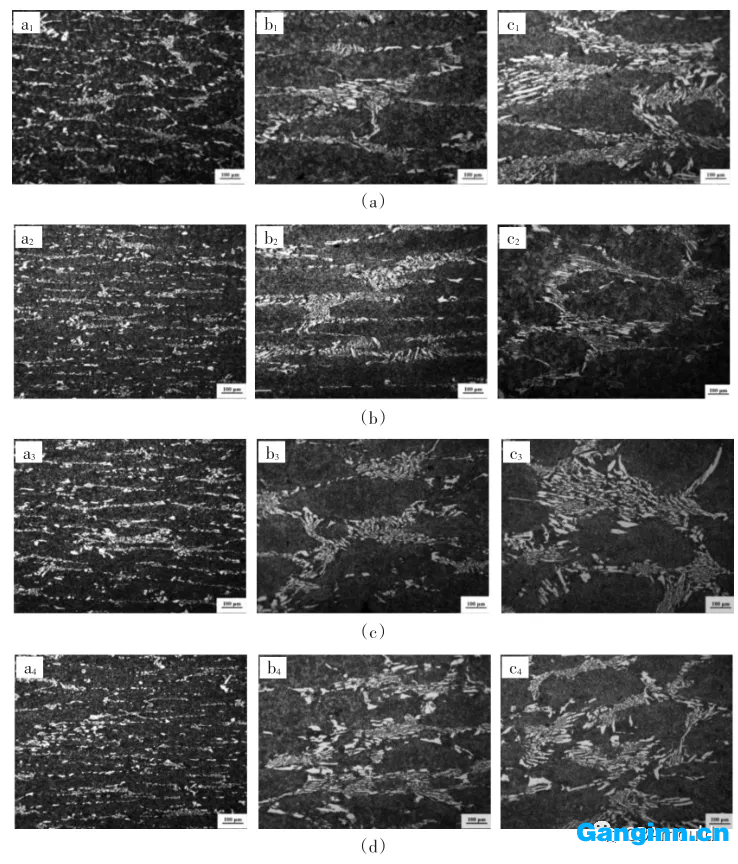 Cr12Mo1V1鑄鋼件經(jīng)熱處理后, 如圖所示1a所顯示的鑄鋼件鍛造態(tài)網(wǎng)狀結(jié)構(gòu)共晶滲碳體沿形變方位呈帶條狀或網(wǎng)狀結(jié)構(gòu)延伸, 形變充足時(shí)呈帶條狀如圖所示1b所顯示, 形變不充足時(shí)網(wǎng)絡(luò)狀如圖所示1c所顯示。實(shí)驗(yàn)鍍鋅扁鋼和園鋼的共晶滲碳體如圖2所顯示, 按GB/T14979-1994規(guī)范中第四定級圖鑒定的共晶滲碳體不勻稱度級別如表3所顯示。