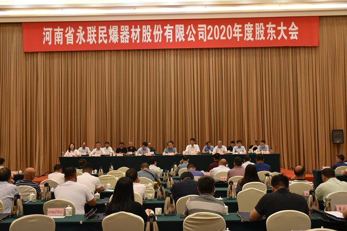 2021年6月29日,河南省永聯民爆器材股份有限公司2020年度股東大會在鄭州黃河迎賓館隆重召開。會議由所持股份1141.78萬股(占公司工商登記總股份的99.46%)的股東或授權代理人參加,由董事長劉嵩同志主持,省委軍民融合辦二級巡視員張衛東、民爆局局長王玉生應邀出席會議。