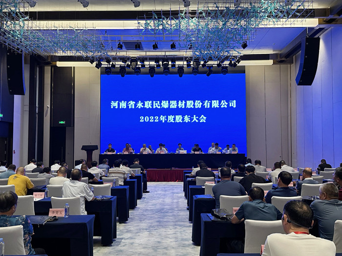 2023年6月29日,河南省永聯民爆器材股份有限公司2022年度股東大會在鄭州喆鵬酒店隆重召開。會議由所持股份1138.56萬股(占公司工商登記總股份的99.18%)的股東或授權代理人參加,由董事長劉嵩同志主持。